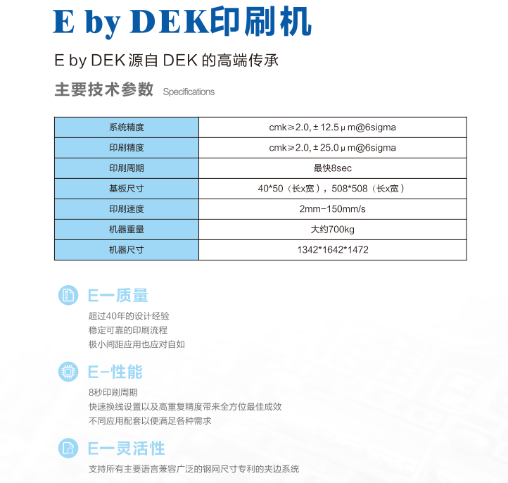 Eby DEK印刷機(jī),歐洲設(shè)計(jì),新加坡制造。穩(wěn)健平臺(tái),品質(zhì)與技術(shù)兼具,易操作界面和容易使用??煽康挠∷①|(zhì)量與重復(fù)性能。
