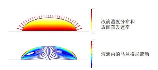 -液滴蒸發(fā)過程:液滴在蒸發(fā)過程中,邊緣處的溶質(zhì)濃度增加或溫度下降可能導(dǎo)致表面張力增大,形成向中心的馬蘭格尼流,影響蒸發(fā)速率和液滴形態(tài)演化。