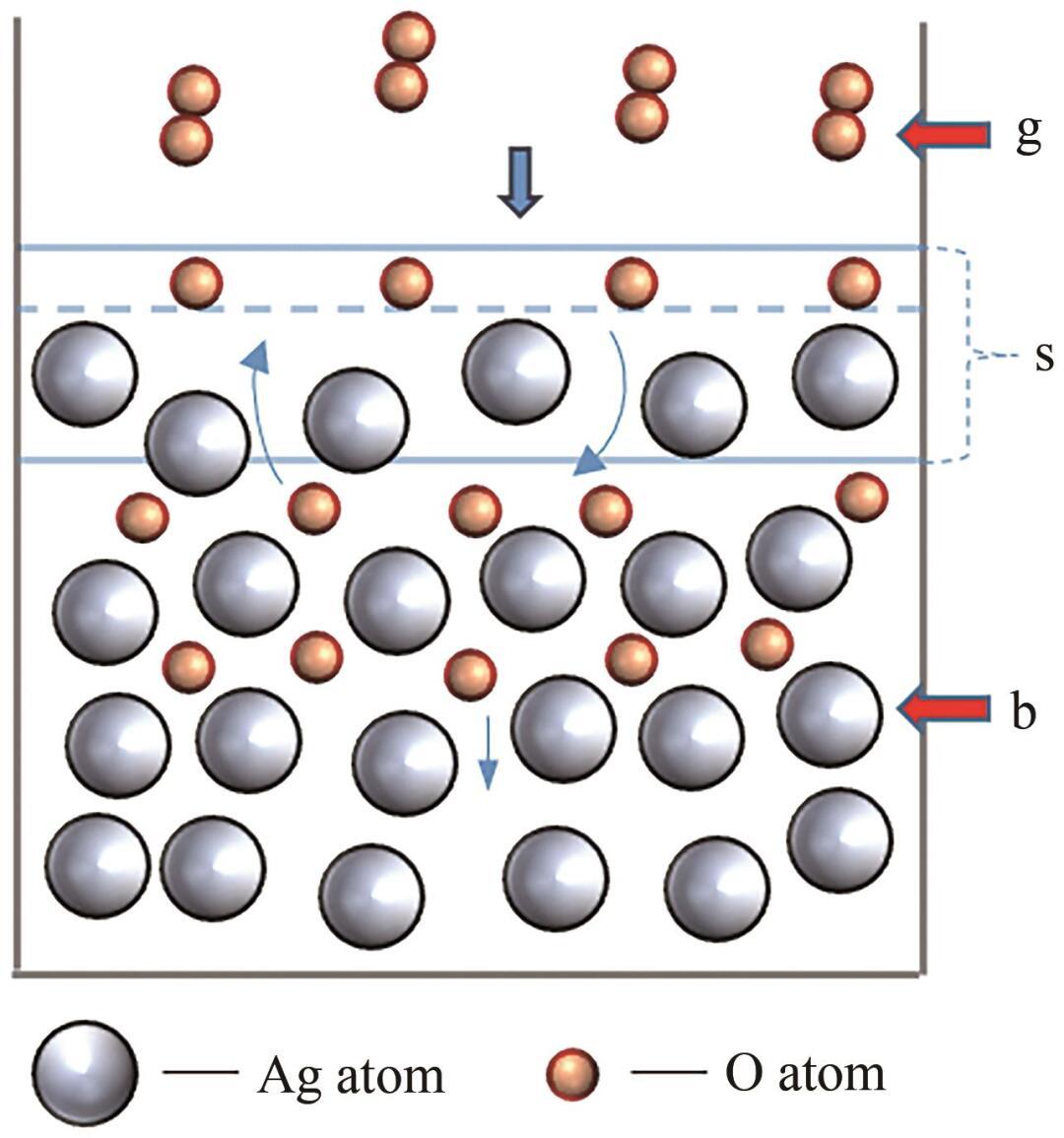 根據(jù)圖1,首先O2分子從氣相(g)擴(kuò)散至表面相(s);其次在A(yíng)g的催化下解離為O原子,并發(fā)生化學(xué)吸附;最后,O原子從表面相(s)擴(kuò)散至本體相(b)。整個(gè)過(guò)程可以表示為: