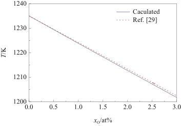 根據(jù)式(23)計(jì)算了Ag-O系的液相線(xiàn),結(jié)果如圖2所示。從圖中可以觀(guān)察到,理想溶體近似模型的計(jì)算值與實(shí)驗(yàn)相圖[29]非常吻合。因此,可以將Ag-O系視為理想溶體。