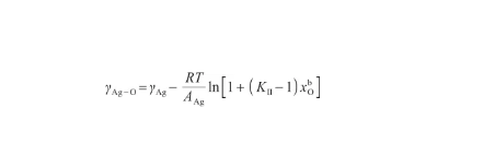 由式(12)和(13)可以看出,Butler方程計(jì)算較為復(fù)雜。考慮液態(tài)氧的表面張力很小[14],可以認(rèn)為γO≈0。另外,由于A(yíng)g-O系中O原子數(shù)遠(yuǎn)小于A(yíng)g原子數(shù)[29],可以將Ag-O溶體視為理想溶體。此時(shí),GE,b=G=G=0。根據(jù)文獻(xiàn)[18],當(dāng)式(12)所示的Butler方程用于描述理想溶液時(shí),通過(guò)假設(shè)系統(tǒng)內(nèi)兩組分具有相等的摩爾表面積,可以得到改進(jìn)的Butler方程。這個(gè)改進(jìn)的Bulter方程能夠推導(dǎo)出Gibbs吸附方程和Langmuir方程,被認(rèn)為是表面張力和溶液吸附的根本方程。因此,令A(yù)Ag=AO,將式(12)變換為: