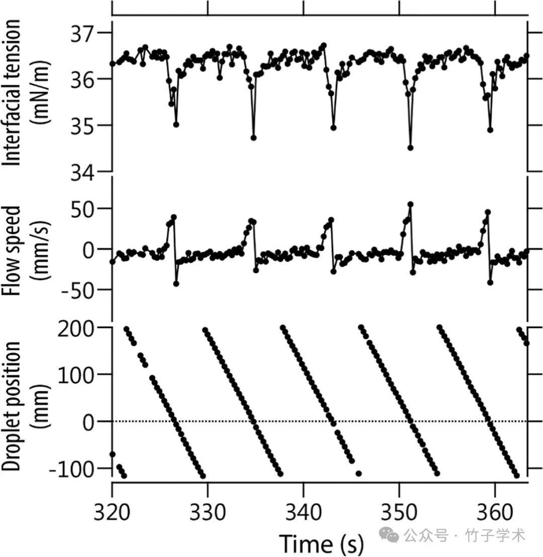 結果,當液滴通過時間分辨測量的采樣位置時,觀察到界面張力的周期性減小以及向前和向后流動的速度的周期性增加。當它們轉換為液滴位置的空間分布時,沒有觀察到液滴前后界面張力差對液滴速度的依賴性。另一方面,隨著液滴速度的增加,向前和向后流動的速度都增加。通過簡化模型對上述結果的分析,表明液滴前沿界面張力梯度驅動的前向流動實際上在液滴單向自推進運動機制中發(fā)揮著重要作用。