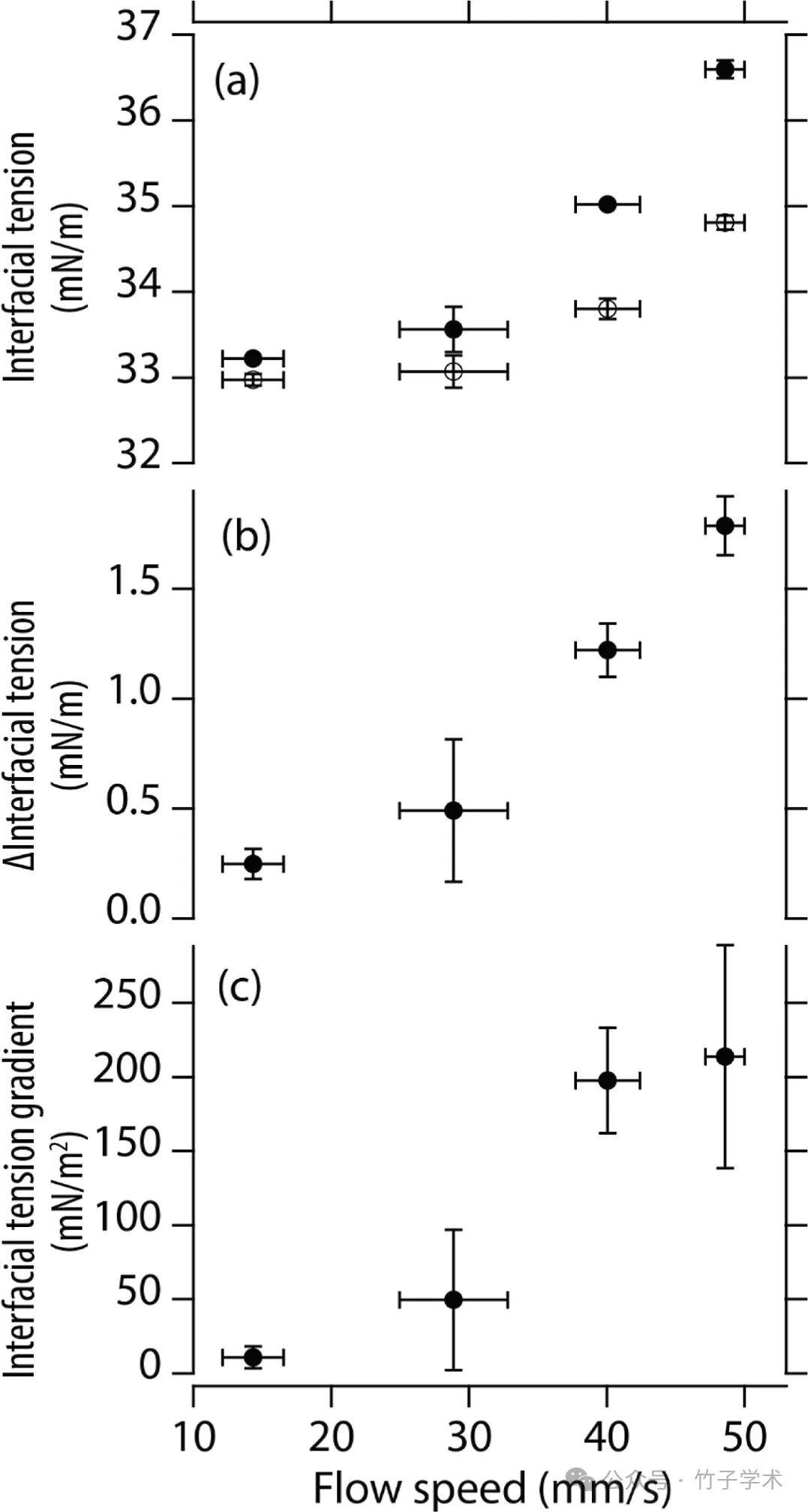 圖8是(a)液滴前面的系統(tǒng)界面張力的最大值(實心圓)和液滴前面的外推界面張力(空心圓)作為前端流速的函數。(b)上述最大值和前沿值之間的界面張力差與前沿流速的關系。(c)前沿流速與前沿界面張力梯度之間的關系。