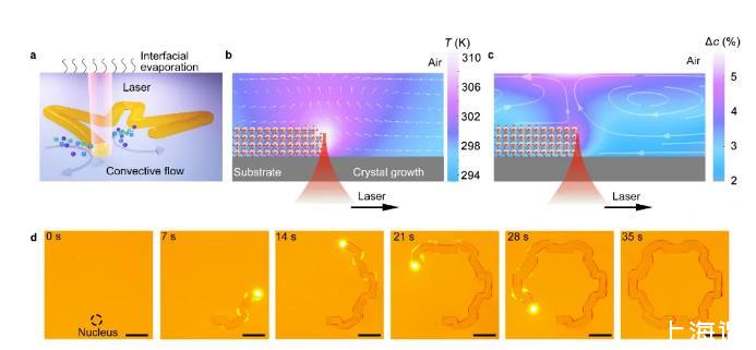 研究者利用COMSOL模擬了激光照射下鈣鈦礦晶體周圍的局域過飽和度,并通過實(shí)驗(yàn)驗(yàn)證了過飽和度產(chǎn)生的原理。其中馬倫格尼對(duì)流的引入加速了傳質(zhì)過程,使得鈣鈦礦結(jié)構(gòu)能夠在激光誘導(dǎo)下快速生長,在實(shí)驗(yàn)中,MAPbBr3鈣鈦礦單晶的生長速度可達(dá)0.1 mm/s,顯著快于傳統(tǒng)的鈣鈦礦單晶制備方法。激光閾值功率約為150μW,低于現(xiàn)有的激光調(diào)控鈣鈦礦結(jié)晶過程方法。