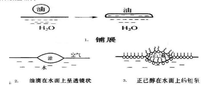第二種方式,鋪展方式。在上述的液-固界面的潤(rùn)濕作用,液體在固體表面的鋪展也可以引用到液液界面,不過(guò)此時(shí)的鋪展過(guò)程復(fù)雜一些。比如在清潔的水面上,滴加不溶性“油”滴,此時(shí)的“油”在水面上,可能表現(xiàn)出三種不同的狀態(tài):
