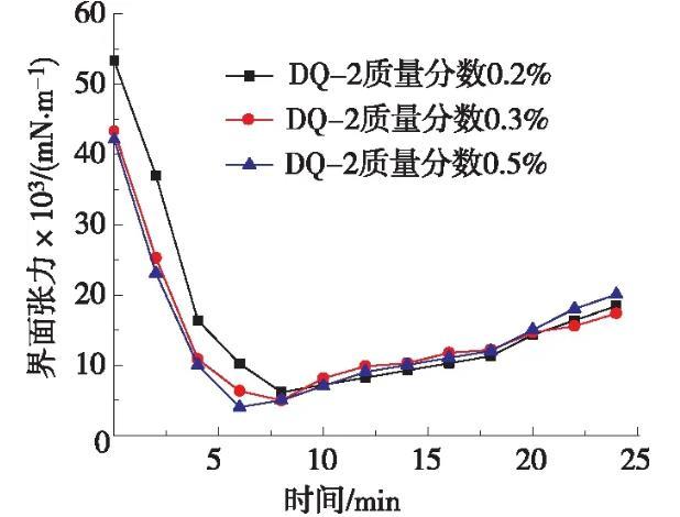 測定低界面張力表面活性劑DQ-2體系的質量分數(shù)分別為0.2%,0.3%,0.5%的油水界面張力,不同濃度目標體系的油水界面張力隨時間變化曲線見圖1。