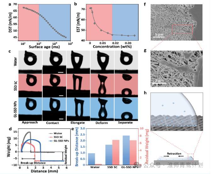 然后,作者研究了GL-SSD NPs液滴在疏水表面的沉積機(jī)理。先是測(cè)量了GL-SSD NPs溶液的動(dòng)態(tài)表面張力(DST)和粘度。DST結(jié)果顯示,GL-SSD NPs溶液在前100 ms內(nèi)發(fā)生輕微變化,這意味著GL-SSD NPs的擴(kuò)散速率較慢,EST值隨著濃度從0到0.018 wt%的增加而減小到45 mN m?1,而當(dāng)濃度高于0.018 wt%時(shí),EST值保持不變。因此,0.018 wt%作為GL-SSD NPs的臨界膠束濃度(CMC)清楚地觀察到接近、接觸、伸長(zhǎng)、變形和分離的順序過(guò)程。從PTFE表面分離后,水滴從表面被徹底清除,沒(méi)有留下任何殘留物,而SSD SC和GL-SSD NPs液滴在中間發(fā)生了明顯的伸長(zhǎng)和斷裂,在表面保留了大量的液體。水、SSD SC和GL-SSD NPs的殘余質(zhì)量分別為0.35、6.9和6.8 mg,而GL-SSD NPs溶液的破裂距離為2.43 mm,遠(yuǎn)高于水和SSD SC的0.97 mm和1.68 mm,表明GLSSD NPs與PTFE表面的相互作用最強(qiáng)。此外,掃描電鏡(SEM)圖像顯示,撞擊后的縮回軌跡中留下了大量的液滴殘留物。在液滴撞擊過(guò)程中,大量GL-SSD NPs在三線處的沉積會(huì)利用PTFE表面固有的親水性改變其潤(rùn)濕性,產(chǎn)生固定點(diǎn),延緩液滴縮回。