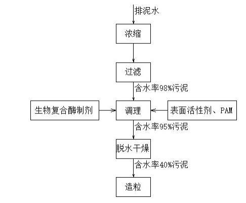 經(jīng)純水稀釋后以0.008%比例和用自來(lái)水配置的濃度為0.1%的陰離子聚丙烯酰胺(分子量為800-1000萬(wàn))溶液加入到步驟S2中的混合料2中,以60r/min速度均勻攪拌,調(diào)理15min后得到含水率為95%的混合料3;