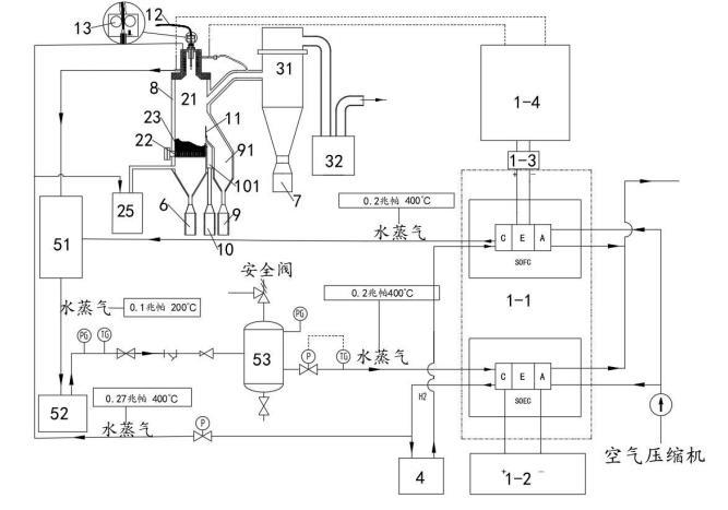 所述供電模塊1中的SOFC燃料電池產(chǎn)生的水蒸氣(0.2Mpa,400℃)進(jìn)入所述汽水混合加熱器51中,所述等離子噴射模塊2、分離過濾模塊3、粗粉收集罐6、細(xì)粉收集罐7與冷卻模塊8換熱后的水(當(dāng)冷卻介質(zhì)為水時(shí))也進(jìn)入所述汽水混合加熱器51中,通過所述汽水混合加熱器51的作用將其轉(zhuǎn)化為水蒸氣并傳輸?shù)剿稣羝l(fā)生器52中,所述蒸汽發(fā)生器52將水蒸氣以(0.2Mpa,400℃)的狀態(tài)傳輸?shù)椒€(wěn)壓罐53中,通過穩(wěn)壓罐53穩(wěn)壓并去除水蒸氣中夾雜的水滴后,高溫的水蒸氣進(jìn)入SOEC電解池中參與電解制氫,并通過儲氫模塊4將制備的氫氣存儲備用。該過程將分離提純過程中供電模塊1中燃料電池燃燒放電產(chǎn)生的高溫水蒸氣與冷卻換熱的熱量加以回收利用,為SOEC電解池提供熱量,避免或減少外部能量的輸入,降低成本。