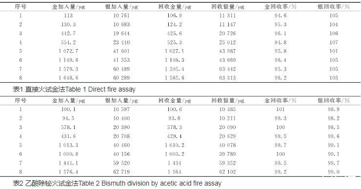 表2結(jié)果為用乙酸除鉍火試金法,再進行如表1的實驗,從表2可以看出金加標(biāo)回收率99.2%~101%,銀加標(biāo)回收率98.2%~99.7%,說明已消除鉍的干擾,結(jié)果準(zhǔn)確可靠。