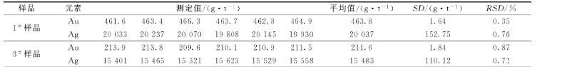 選取兩個粗鉍樣品,1#和3#樣品進行實驗,稱取2.000 g粗鉍樣品,按照以上實驗方法進行實驗,每個樣品做了6次平行實驗,結(jié)果如表7所示,金相對標(biāo)準(zhǔn)偏差(RSD)為0.35%~0.87%,銀相對標(biāo)準(zhǔn)偏差(RSD)為0.76%~0.71%。
