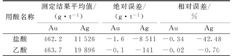 鉍氧化過程中,氧化鉍進入灰皿粉末吸收,粗鉍里面大部分金銀留在粉末上方,類似用灰皿灰吹。用硝酸溶解,固體物質(zhì)很快就溶解了,但金銀合粒也被溶解了,所以不能用硝酸溶解。用硫酸溶解,固體物質(zhì)和硫酸幾乎不反應(yīng),所以不能使用硫酸。用鹽酸和乙酸可以順利溶解固體物質(zhì),但鹽酸也溶解金、銀。實驗樣品金含量463.8 g/t,銀含量20 037 g/t,得到結(jié)果如表4所示,從表4可知使用乙酸溶解除鉍結(jié)果準(zhǔn)確,所以選用乙酸作為溶解除鉍用酸。