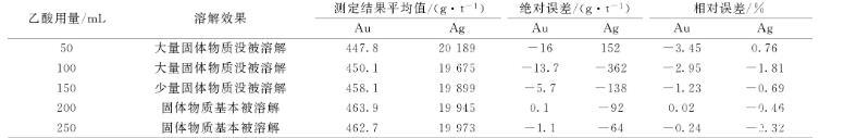 實驗樣品金含量463.8 g/t,銀含量20 037 g/t,進行除鉍用酸量的實驗,試驗用酸為乙酸(1+1),結(jié)果見表5,從結(jié)果可以看出50、100 mL乙酸用量,大部分固體物質(zhì)沒被溶解,大部分鉍沒被除去,乙酸用量200 mL時,固體物質(zhì)基本被溶解,結(jié)果較準(zhǔn)確,可以滿足測定要求。在結(jié)果準(zhǔn)確的情況下選擇用量少的,所以實驗選擇乙酸用量為200 mL。