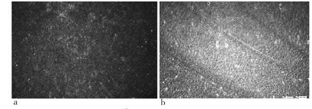 利用BAM研究了DEAE-瓊脂糖單分子膜的成膜過程,圖4為表面壓為0 mN/m和34 mN/m的BAM圖像結(jié)果。通過對BAM圖像的觀測,可以看出其成膜過程,確定其是否成膜。圖4-a為DEAE-瓊脂糖剛滴加在亞相上的BAM圖像,分子被平鋪在亞相表面,相對分散,呈氣相狀態(tài),此時布魯斯特角的折射不受表面分子影像,圖像顏色較深,看不出分子的具體形態(tài)。待其揮發(fā)一定時間后,隨著滑障的持續(xù)壓縮,DEAE-瓊脂糖由分散狀態(tài)到聚集成膜,最后在亞相上形成相對穩(wěn)定的固相區(qū)域。圖4-b為固相狀態(tài)下的DEAE-瓊脂糖單分子膜,可以看出此時分子之間排列緊密,分子間距較小,已經(jīng)形成固相狀態(tài)。由于分子在亞相表面緊密排列形成了單分子層,改變了布魯斯特角的折射,使得圖像的顏色變淺。通過對表面壓為0 mN/m和34 mN/m的BAM圖像對比可以看出,DEAE-瓊脂糖分子由一開始的分散狀態(tài)到達最后穩(wěn)定的固相狀態(tài),成功形成了穩(wěn)定的便于提拉的單分子層。