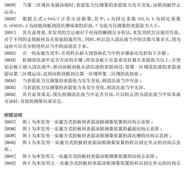 [0014]同時(shí)由于樣品固定單元是位于第一區(qū)域上方的,所以當(dāng)油清洗下來的時(shí)候,首先是在第一區(qū)域的清洗液面擴(kuò)散開來形成油膜。當(dāng)油膜刮板從第一區(qū)域的一端向著第二區(qū)域方向運(yùn)動(dòng)的時(shí)候,油膜就會(huì)向第一區(qū)域運(yùn)動(dòng),當(dāng)?shù)谝粎^(qū)域內(nèi)聚滿油膜的時(shí)候,表面張力儀就會(huì)通過鉑金板片感應(yīng)到清洗液表面張力的變化,此時(shí)油油膜刮板停止運(yùn)動(dòng),計(jì)算出整個(gè)油膜的面積。為了方便計(jì)算油膜的面積,可以在清洗槽的邊沿上設(shè)置相應(yīng)的刻度,同時(shí)將油膜刮板設(shè)置成與清洗槽的邊沿相垂直。最后根據(jù)公式a-b*d/f計(jì)算出油膜量,其中,a為固定系數(shù)102.0,b為固定系數(shù)0.165625,d為油膜刮板到清洗槽端部的距離,f為張力儀測量的表面張力大小。