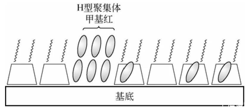 兩親性環(huán)糊精不僅能夠單獨(dú)組裝成LB膜,也能夠和其他有機(jī)分子共同組裝成雜化LB膜。Matsumoto課題組在兩親性環(huán)糊精和偶氮苯LB雜化膜方面做了大量的工作。因?yàn)榕嫉交衔锬軌蛟诠庹諚l件下發(fā)生可逆的順反光異構(gòu)反應(yīng),若將偶氮苯在固體基底上進(jìn)行組裝將對光儲存、光轉(zhuǎn)換器件的發(fā)展具有十分重要的意義。但是由于在單純LB膜中,偶氮苯分子周圍自由體積很小,限制了順反光異構(gòu)反應(yīng)的發(fā)生,而利用兩親性環(huán)糊精和偶氮苯雜化組裝成LB膜以解決這個(gè)問題。研究表明部分偶氮苯被包結(jié)在環(huán)糊精的空腔中,空腔為水溶性偶氮苯發(fā)生可逆的光異構(gòu)化反應(yīng)提供了良好的場所。此外,環(huán)糊精疏水鏈段也能夠成為容納客體分子的場所,而且在膜中并非所有的環(huán)糊精分子都會包結(jié)偶氮苯分子,剩余的未包結(jié)環(huán)糊精為進(jìn)一步功能化提供了基礎(chǔ)。但是在該雜化膜中會有部分偶氮苯分子形成的聚集體(圖2),所以進(jìn)一步增加雜化分子的包結(jié)率和分散性是這一類雜化膜的研究方向。