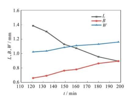 可以看出,從121 min開始,可以觀察到橢球形液滴已經(jīng)初步形成,即從121 min開始計(jì)算橢球形液滴的三軸長度,根據(jù)實(shí)驗(yàn)裝置圖,L和B為x和y方向的液滴長度,W為z方向的長度,根據(jù)公式W=R03/(LB)計(jì)算得到。