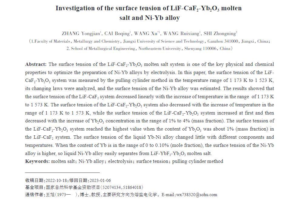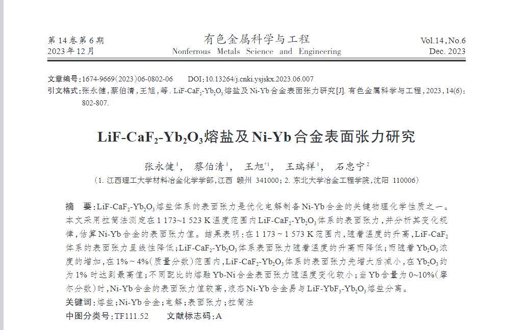 LiF-CaF2-Yb2O3熔鹽體系的表面張力是優(yōu)化電解制備Ni-Yb合金的關(guān)鍵物理化學(xué)性質(zhì)之一。本文采用拉筒法測定在1173~1523 K溫度范圍內(nèi)LiF-CaF2-Yb2O3體系的表面張力,并分析其變化規(guī)律,估算Ni-Yb合金的表面張力值。