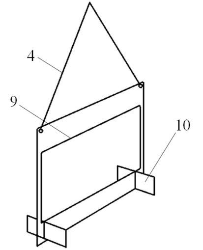 拉力框的設計是本次測試能否成功的關鍵之一,其結構如圖3,與通用的拉力框有很大不同。其形狀如漢字中“口”字的形狀,由厚0.25mm薄鋁片制成。上部底緣稱之為刀口(9),長l=50mm,刀口與液面接觸后拉起液膜(2)。拉力框兩側各寬3mm,其作用是保持拉起的液膜的穩(wěn)定,使之不會過早斷裂。拉力框底部設有張開的與框面垂直的翼片(10),可防止拉力框擺動。拉力框通過輕軟細線懸掛于力敏傳感器(5)上,通過拉動懸線(4),可調整拉力框與液面的平行度。