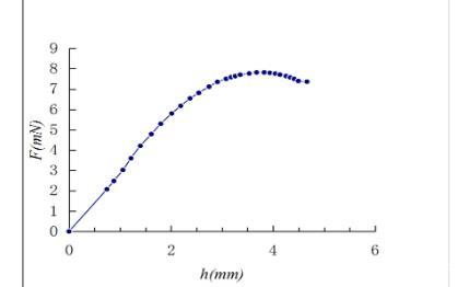 F1的準確計算至關重要,當液面上升至距刀口較小一個距離時,液面會跳躍向上粘住刀口,并引起力敏傳感器讀數(shù)的躍變。液面的跳躍發(fā)生后,以刀口與跳躍時液面的高度差作為液膜第一次拉伸量h1。由于液面高度沒有變化,所以不要考慮浮力的變化,但需考慮第一次帶起液膜的重量。