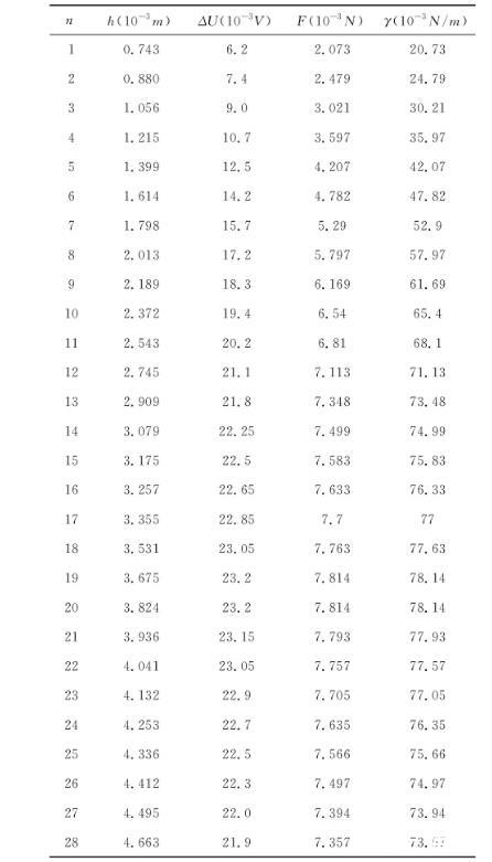 將拉力框置于待測液體中,調節(jié)好刀口與液面的平行度。讓液面緩慢上升至與刀口接觸。然后下降液面,形成并拉伸液膜至液膜斷裂。記錄此過程中液面在不同高度(即液膜不同拉伸長度)時的位置及此時力敏傳感器的讀數(shù)U,根據(jù)f=kU,(力敏傳感器的轉換系數(shù)k=340.2×10-6N/mV),可計算出不同高度的受力大小fn。