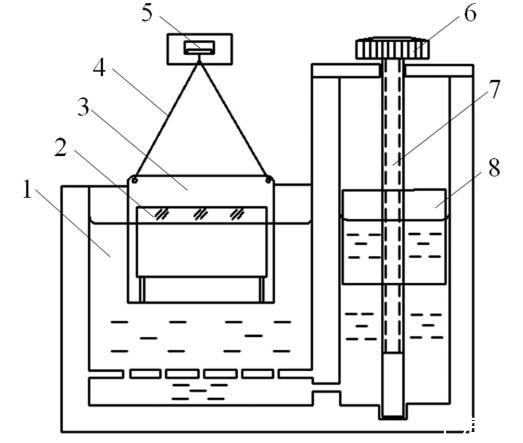 新型表面張力測試儀基本結構如圖2所示,該儀器盛有液體(1),儀器采用連通器結構,截面積較大的左端放置拉力框(3),截面積較小的右端設有升降塊(8),旋動栓鈕(6)和螺桿(7),可使升降塊(8)上升或下降,從而引起液面相應的但速度更緩慢的升降。為減小液面升降時的波動,容器的兩端通過若干均勻分布的小孔相連通。為便于觀測液面位置,容器壁采用透明的有機玻璃材料,通過讀數(shù)顯微鏡確定液面高度。
