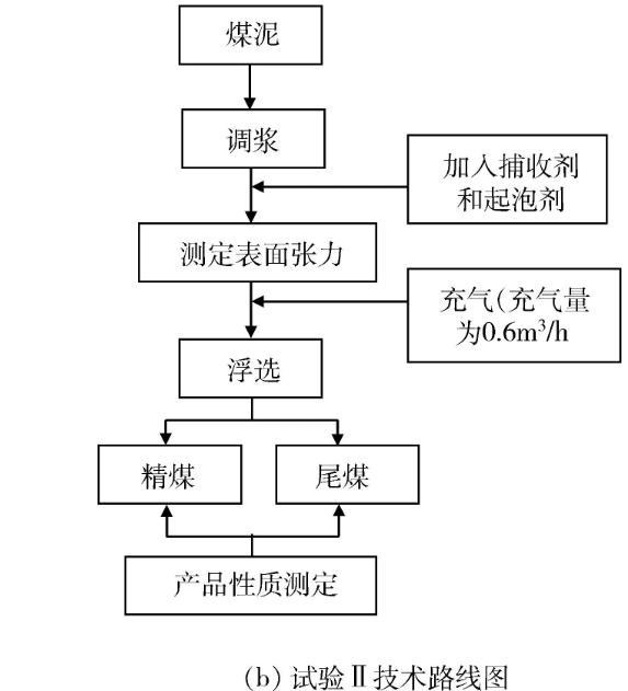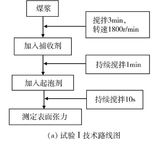 試驗分為試驗Ⅰ和試驗Ⅱ兩部分。在試驗Ⅰ中,先后改變捕收劑和起泡劑用量,對添加浮選藥劑后煤漿的表面張力進行測定,以研究浮選藥劑用量對煤漿表面張力影響的規(guī)律。在試驗Ⅱ中選用煤油/仲辛醇做捕收劑/起泡劑,先后改變煤油和仲辛醇的用量,按照《GB/T 4757-2013煤粉(泥)實驗室單元浮選試驗方法》對馬蘭2#煤泥進行浮選試驗,并在浮選充氣前對煤漿同步進行表面張力的測定,進一步對浮選過程中浮選藥劑量、煤漿表面張力及浮選效果之間的關系進行探索。試驗控制煤漿濃度為100 g/L,溫度為22±0.2℃;使用一次去離子水(pH值為7.0±0.2)。試驗技術路線見圖1。