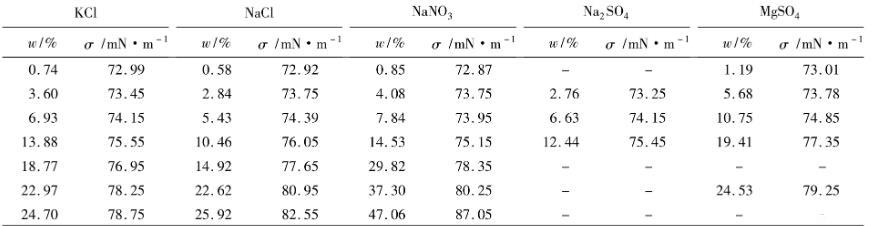 表2 293 K下,無機鹽的質(zhì)量分?jǐn)?shù)與水溶液界面張力的關(guān)系