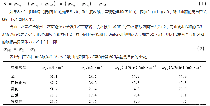 表1有機液體(油)與水接觸時的界面張力