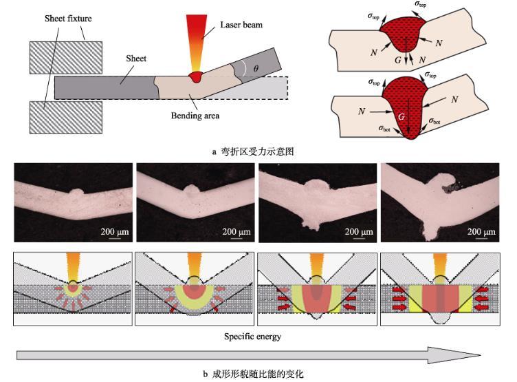 另一方面,材料內部的溫度梯度和界面表面張力亦會導致彎折區(qū)的形貌發(fā)生改變。通過觀測不同比能和掃描次數(shù)下薄板彎折區(qū)的成形狀態(tài)發(fā)現(xiàn),在高比能、多次掃描下,彎折區(qū)界面的形貌由凸向凹演變,潤濕角顯著降低,如圖1c所示??梢?,比能和掃描次數(shù)是造成形貌發(fā)生變化的重要因素,最終通過影響熔池的表面張力和溫度梯度,進而影響彎折區(qū)的宏觀形貌。
