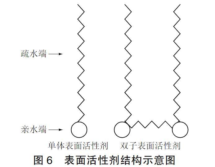 從漿液固化反應機理分析:在CW灌漿材料配方中除環(huán)氧樹脂外,還含有糠醛、丙酮等成分。體系中存在3種化學反應,既有環(huán)氧基團與固化劑的逐步聚合反應,也有糠醛、丙酮之間а氫的反應,還有糠醛、丙酮與固化劑中胺的反應。隨著反應時間的延長,體系分子量不斷增加,從而導致漿液的表面張力和接觸角均隨時間的延長而不斷增加。從圖3中可以看出加入表面活性劑S1、S2能降低漿液的表面張力和接觸角。這是因為本次漿液改性選用的表面活性劑S1、S2從化學結構上屬于雙子型非離子表面活性劑。傳統(tǒng)表面活性劑和雙子型表面活性劑結構示意圖如圖6所示。親水端疏水端單體表面活性劑雙子表面活性劑。