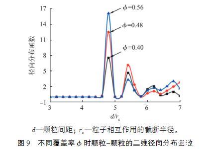 本文中主要關(guān)注與顆粒間相互作用有關(guān)的維里項(xiàng)對(duì)界面張力的影響。為了研究顆粒間相互作用對(duì)界面張力的影響,本文中建立了油-水界面的多顆粒吸附模型。界面張力與顆粒在界面上的覆蓋率有關(guān),界面覆蓋率?可定義為?=nπd20/4A,其中n為界面吸附顆粒的個(gè)數(shù),A為界面面積,d0為界面顆粒與顆粒之間的二維徑向分布函數(shù)第一個(gè)最高峰橫坐標(biāo),表示顆粒與顆粒間的最短距離。圖9所示為3種不同覆蓋率時(shí)顆粒-顆粒的二維徑向分布函數(shù)。圖中曲線第一個(gè)最高峰值的橫坐標(biāo)為4.8rc,表示界面上顆粒間的最短距離,也被視為顆粒的有效半徑,可通過(guò)該有效半徑獲得顆粒的真實(shí)覆蓋率。
