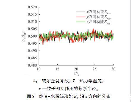 在界面張力的模擬計(jì)算公式(5)中,界面張力來(lái)源于界面附近處法向壓力和切向壓力的差值,pxx、pyy和pzz是壓力張量p的3個(gè)對(duì)角分量,壓力張量p又可以進(jìn)一步分解為與原子速度和力有關(guān)的項(xiàng),即p=(2EK+EV)/V,其中EK為與原子速度有關(guān)的動(dòng)能項(xiàng),V為系統(tǒng)的體積,EV為與原子間相互作用力有關(guān)的維里項(xiàng),EV=∑Ng=1Fg?rg,其中Fg為系統(tǒng)中作用于原子g的力,rg為原子g的位置,N為系統(tǒng)中的原子總個(gè)數(shù),?表示張量積。由于Δp=pzz-0.5(pxx+pyy),也可以寫(xiě)成Δp(2ΔEK+ΔEV)/V,其中動(dòng)能的變化量ΔEK可以定義為,其中Δp為壓力的變化量,ΔEV為維里項(xiàng)的變化量,EKzz為z方向的動(dòng)能項(xiàng),EKxx為x方向的動(dòng)能項(xiàng),EKyy為y方向的動(dòng)能項(xiàng)。為了觀察動(dòng)能項(xiàng)對(duì)界面張力的貢獻(xiàn),本文中計(jì)算了純油-水系統(tǒng)的動(dòng)能沿z方向的分布,結(jié)果如圖8所示。從圖中可以看出,純油-水系統(tǒng)的動(dòng)能在界面附近基本不變,即動(dòng)能的貢獻(xiàn)很小,與文獻(xiàn)中的研究結(jié)果一致,因此壓力張量p中與原子相互作用有關(guān)的維里項(xiàng)在界面張力中起主要作用。因?yàn)閴毫埩恐械膭?dòng)能項(xiàng)對(duì)壓力影響很小。