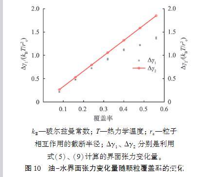 圖10油-水界面張力變化量隨顆粒覆蓋率的變化第二種方法是考慮所有因素對(duì)界面張力的影響,利用式(5)計(jì)算界面張力的變化Δγ1,如圖10中的黑點(diǎn)所示,黑點(diǎn)中的誤差棒是獨(dú)立計(jì)算多次結(jié)果得到的誤差。隨著顆粒覆蓋率的增加,界面張力降幅增大。Δγ1和Δγ2的變化趨勢(shì)是一致的,都是隨著界面覆蓋率的增大,界面張力降幅增大。在覆蓋率較小時(shí),由于顆粒數(shù)量較少,在界面分布較為稀疏,使得顆粒間相互作用不明顯,因此顆粒間相互作用對(duì)界面張力的計(jì)算沒(méi)有太大的影響,Δγ1和Δγ2變化趨勢(shì)基本一致。隨著覆蓋率的增大,Δγ2>Δγ1。由于直接利用吸附能和吸附顆粒數(shù)量計(jì)算界面張力存在明顯的局限性,因此接下來(lái)要進(jìn)一步研究顆粒間相互作用對(duì)界面張力的影響。