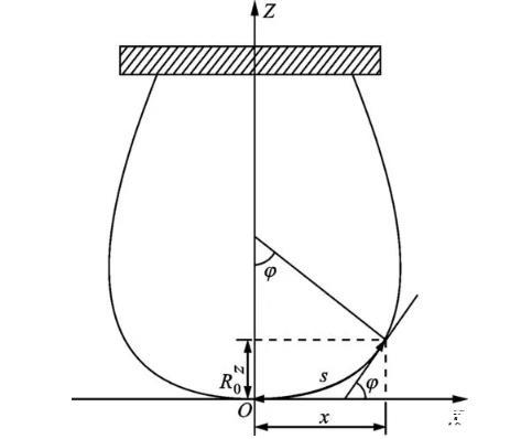 懸滴法利用測定處于重力與表面張力平衡狀態(tài)的液滴外形,獲得待測液體的表面張力。懸滴外形的幾何關系如圖1所示,在考慮液體靜壓作用的基礎上,由經(jīng)典Young-Laplace方程推導得歸一化Bashforth-Adams工作方程為,式中:σ為表面張力;φ表示外形輪廓線某點切線與橫坐標夾角;s為弧長;R0為頂點曲率半徑;ρl、ρg分別表示液相和氣相密度;g代表當?shù)刂亓铀俣?,本文取?.7965 m·s-2。