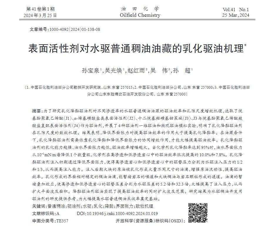 摘要:為了研究乳化降黏驅油劑對不同滲透率的水驅普通稠油油藏的驅油效率和孔隙尺度增效機理,選取了烷基酚聚氧乙烯醚(J1)、α-烯基磺酸鹽類表面活性劑(J2)、十二烷基羥磺基甜菜堿(J3)、J3與烷基酚聚氧乙烯醚羧酸鹽復配表面活性劑(J4)作為驅油劑,開展了4種驅油劑一維驅油和微觀驅油模擬實驗,明確了乳化降黏驅油劑在孔隙尺度的致效機理。