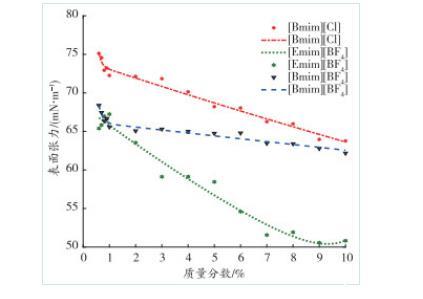 圖2表面張力與離子液體質(zhì)量分數(shù)之間的關(guān)系