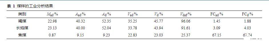 選取不同變質(zhì)程度的褐煤、焦煤及長焰煤,將煤樣放入球磨機中粉碎,并通過篩網(wǎng)過濾出粒徑在0.074 mm(200目)以上的煤粉,置于45℃真空干燥箱中干燥24 h后放入密封袋中低溫、避光保存。利用全自動工業(yè)分析測定儀對3種煤樣的水分、灰分和揮發(fā)分進行測定,計算固定碳,其工業(yè)分析結(jié)果如表1所示。