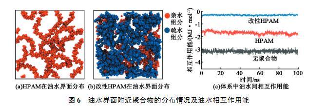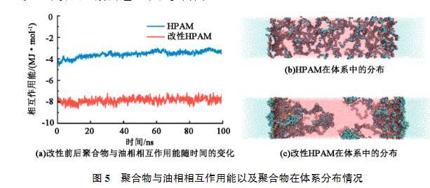 界面張力來自于界面處分子受到的應(yīng)力不均衡,因此需要增加兩相之間的聯(lián)系,從而減少界面張力。由于HPAM分子本身親水,與水相具有較強(qiáng)的相互作用,因此主要考察HPAM和油相之間的相互作用強(qiáng)度。圖5(a)為HPAM和改性HPAM與油相的相互作用能隨時(shí)間的變化??梢钥闯?,HPAM在0~100 ns的模擬過程中相互作用強(qiáng)度逐漸降低,說明部分HPAM從油水界面處脫離進(jìn)入水相。由圖5(b)也看出HPAM分子大量均勻分布在水相中,其主要原因也是缺少親油基團(tuán),不易在界面處穩(wěn)定存在,更傾向于溶解于水中。而引入疏水基團(tuán)改性后的HPAM與油相的相互作用能明顯強(qiáng)于HPAM與油相的作用能。由圖5(c)看出改性HPAM大多數(shù)分布在油水界面附近。改性HPAM在界面處橋接了油相與水相,緩解了界面處分子應(yīng)力不均衡,從而起到降低界面張力的效果。