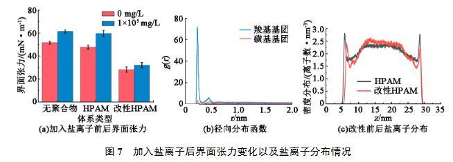 部分儲層中存在較高的礦化度,為此進(jìn)一步研究鹽離子對界面張力的影響。在3個(gè)體系的水相中分別加入質(zhì)量濃度為100 g/L的NaCl,觀察其對界面張力的影響情況,結(jié)果見圖7(a)??梢钥闯觯瑢τ跊]有聚合物存在的體系中,界面張力會隨著鹽離子的增加而增大。這是由于鹽離子的存在增大了水相的極性,從而拉大了油水兩相性質(zhì)上的差距,增大了油水界面張力。因此當(dāng)界面處的鹽離子增多時(shí),界面張力則會增大。加入HPAM的體系中也出現(xiàn)了類似的情況。然而引入磺酸基團(tuán)改性后的HPAM則受鹽離子的影響較小。為了解釋這一現(xiàn)象的物理機(jī)制,分析了帶電基團(tuán)周圍Na+分布(圖7(b))。通過計(jì)算徑向分布函數(shù)g(r),發(fā)現(xiàn)羧酸基團(tuán)周圍吸引了較多的Na+,導(dǎo)致Na+在聚合物附近聚集,而改性引入的磺酸基團(tuán)具有一定的抗鹽作用,其周圍分布的Na+數(shù)量更少。這也就導(dǎo)致2種體系界面附近Na+密度不同(圖7(c))。由于HPAM含有較多的羧酸基團(tuán),會引起Na+在聚合物附近的富集,導(dǎo)致界面張力的增加。而在加入改性HPAM后,引入的磺酸基團(tuán)對Na+的吸引力較弱,導(dǎo)致界面附近的Na+和改性前相比有明顯的減少,界面張力增加較少。因此加入磺化改性的HPAM在高礦化度下仍然可以保持較高的界面活性。