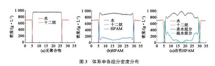 聚合物改變油水界面張力的本質(zhì)是油水界面特征的改變,為此分析各個(gè)組分在體系中的密度分布情況,結(jié)果見圖3??梢钥闯觯跊]有聚合物的情況下,油水界面非常清晰,油相和水相處于完全分離的狀態(tài)。加入HPAM后,油相的分布幾乎沒有變化,而界面處水相密度變化的斜率略有減少,說明HPAM主要分布在水相中,在一定程度上減少了界面上水分子的數(shù)量。但由于HPAM和油相之間的相互作用較弱,因此并沒有改變油相在界面附近的分布情況。改性HPAM的加入對油水兩相的密度分布影響都較大,界面處油相密度變化的斜率減小,說明親油組分和油分子相互融合,從密度分布還可以看出由于聚合物的加入,油相和水相被聚合物顯著分離。