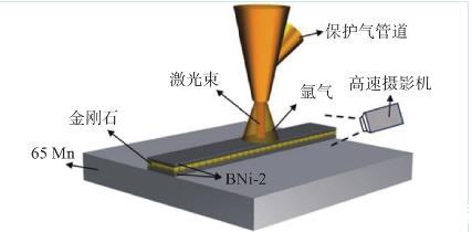 前期開展了激光釬涂金剛石技術(shù)研究,分析了激光功率和掃描速率對涂層微觀組織與力學(xué)性能的影響。從現(xiàn)有研究來看,已有的激光釬涂金剛石研究大多數(shù)集中于金剛石/釬料合金界面的組織演變和單層金剛石工具的機(jī)械加工性能方面,在釬涂層的成形過程方面尚未進(jìn)行深入的研究工作。前期研究發(fā)現(xiàn),在激光釬涂金剛石過程中,金剛石易于向表面聚集,這對涂層的整體性能提升將會產(chǎn)生極大的影響,因此需要針對涂層的成形行為及其機(jī)理方面進(jìn)行深入的研究,進(jìn)一步提升涂層的耐磨性能。文中采用BNi-2合金作為釬料,利用光纖激光在65Mn鋼基體上制備金剛石涂層,并利用高速攝影技術(shù)觀察金剛石激光釬涂過程中,鎳基粉末形成涂層和金剛石遷移全過程,分析釬涂層的成形行為及其機(jī)理,并討論激光釬涂金剛石的能量轉(zhuǎn)換與傳遞路徑,以期為激光釬涂金剛石的工程應(yīng)用提供數(shù)據(jù)支撐。