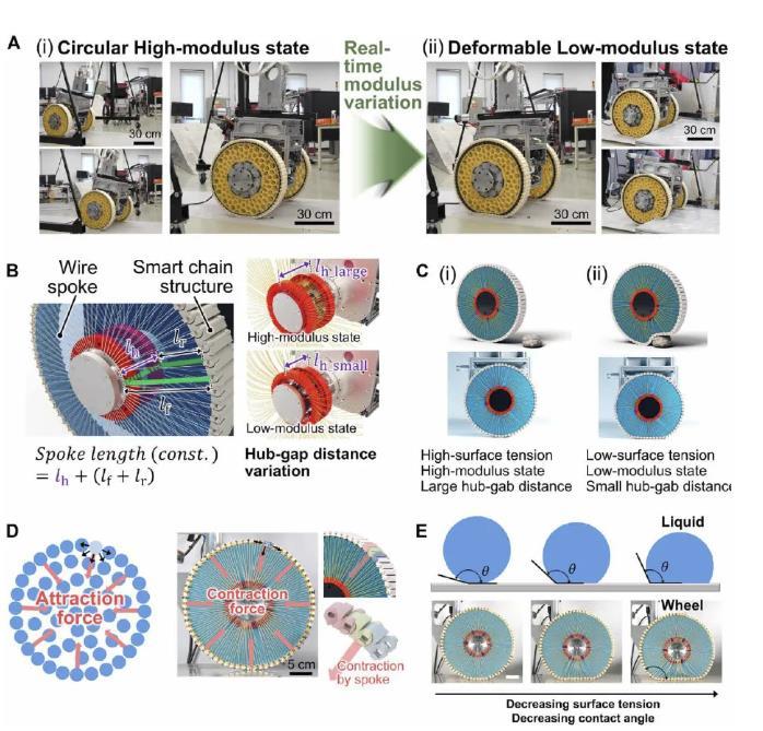 這是一個受液滴表面張力啟發(fā)的可變剛度輪。在液滴中,隨著最外層液體分子的內(nèi)聚力的增加,將液體分子向內(nèi)拉的凈力也增加。這導致高表面張力,導致液滴從引力引起的扭曲形狀恢復為圓形。同樣,車輪的形狀和剛度是通過改變最外層智能鏈塊的牽引力來控制的。隨著連接到每個鏈塊的鋼絲輻條張力的增加,車輪特性反映了一般圓剛輪的特性,這在正常平坦地面上的高速運動中具有優(yōu)勢。相反,隨著線輻條張力的減小,車輪的模量減小,并且根據(jù)障礙物的形狀,車輪容易變形。這使得輪子適合克服障礙物,而不需要復雜的控制或傳感系統(tǒng)。在此機理的基礎上,將輪子應用于重達120 kg的兩輪輪椅系統(tǒng),實時實現(xiàn)了輪椅在室外環(huán)境中駕駛時,圓形高模量狀態(tài)和可變形低模量狀態(tài)的狀態(tài)轉(zhuǎn)換。