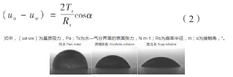 由上式可以看出,基質(zhì)吸力的大小與表面張力、接觸角和曲率半徑有關(guān)。其中,基質(zhì)吸力的大小與表面張力成正比,與彎液面曲率半徑成反比。因此,表面張力和曲率半徑的變化均會導(dǎo)致基質(zhì)吸力的改變。在環(huán)境溫度為25℃時,通過JC2000型接觸角測量儀對三種試樣的孔隙液體進行接觸角測量。得到三種不同表面張力液滴的幾何形態(tài)圖如圖4所示,測量可得純水、酒精溶液和肥皂水對應(yīng)的接觸角分別為85°、65°和42°,而在25℃環(huán)境下,純水、20%酒精溶液、2 g L-1肥皂水的表面張力系數(shù)分別為:7.1×10-2N m-1、4.1×10-2N m-1、2.9×10-2N m-1。表面張力是決定彎液面形狀的主要因素之一,會影響曲率半徑和接觸角的大小。很顯然,表面張力大的液體接觸角變大,曲率半徑變小。圖4中水滴表面張力大于酒精溶液,但形成的彎液面半徑卻要小于酒精溶液,同樣的,酒精溶液形成的彎液面半徑又小于肥皂水。曲率半徑越小,土體中的基質(zhì)吸力越大??紫端砻鎻埩澮好娴那拾霃疆a(chǎn)生改變從而對基質(zhì)吸力產(chǎn)生影響,最終影響土壤的收縮開裂。