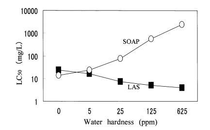 在預(yù)測試中,大型水蚤在 4 鹽混合中存活 溶液,但不能在 CaCl2?H2O 溶液中存活,也不能 蒸餾水。 另一方面,羅漢松在所有 3 種水中都能存活。 因此,羅漢果被用來 檢查水硬度成分對(duì) LAS 和 SOAP 的毒性。 如圖 3 所示,CaCl2?H2O 之間沒有觀察到毒性值的差異 溶液和四鹽混合溶液。 肥皂的毒性 隨著水硬度的增加而降低,和 LAS的毒性隨著水硬度的增加而增加。