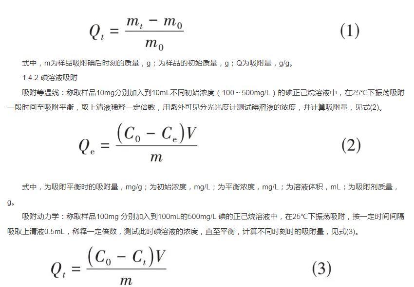 式中,m為樣品吸附碘后時(shí)刻的質(zhì)量,g;為樣品的初始質(zhì)量,g;Q為吸附量,g/g。