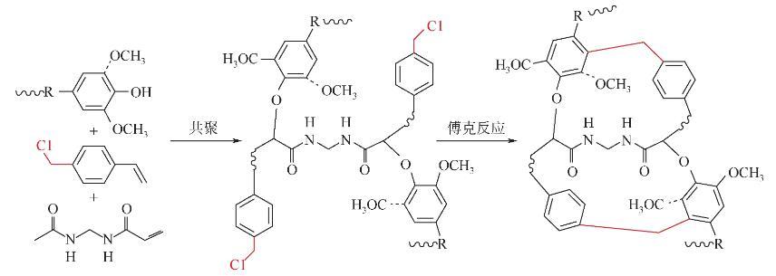 以上文獻(xiàn)表明木質(zhì)素基多孔聚合物作為吸附劑擁有巨大潛力,但目前報(bào)道的木質(zhì)素基聚合物的比表面積仍相對(duì)較小,且多為介孔大孔結(jié)構(gòu),雜原子含量不高,吸附性能仍有待提高。此外,將其應(yīng)用于放射性碘捕獲也很少有文獻(xiàn)報(bào)道。基于此,本文擬采用多步化學(xué)交聯(lián)策略,即先通過(guò)自由基共聚反應(yīng)接枝一定量的可烷基化或?;鶊F(tuán)的芳香族單體,且聚合中加入少量含雜原子的雙烯單體,使其得到理想的親疏水性以及充足的碘親和位點(diǎn)。接著,通過(guò)Friedel-Crafts反應(yīng)使上述內(nèi)親電試劑在木質(zhì)素共聚物的大分子鏈之間搭建大量由亞甲基等剛性基團(tuán)形成的交聯(lián)橋,原位構(gòu)筑剛性結(jié)構(gòu)支撐的雜原子修飾木質(zhì)素基超交聯(lián)聚合物,從而保證其對(duì)碘蒸氣或碘溶液具有快速的吸附速率、良好的穩(wěn)定性和高的吸附容量。