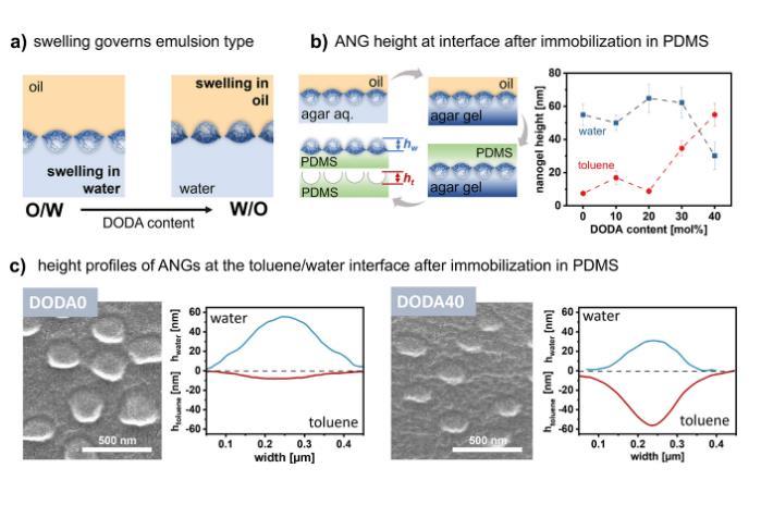 圖4的主要內(nèi)容是關(guān)于納米凝膠在甲苯/水界面的膨脹、位置和變形。作者通過實(shí)驗(yàn)研究了不同親水性納米凝膠在甲苯/水界面上的行為。實(shí)驗(yàn)使用了不同親水性的納米凝膠(DODA0-DODA40),通過在凝膠陷阱技術(shù)中固定納米凝膠在油/水界面上,然后通過原子力顯微鏡(AFM)測(cè)量納米凝膠在水和甲苯中的突出高度。結(jié)果表明,親水性較強(qiáng)的DODA0納米凝膠在水中突出較高,而在甲苯中突出較低;而親水性較弱的DODA40納米凝膠在水中突出較低,而在甲苯中突出較高。這些結(jié)果表明,納米凝膠的親水性會(huì)影響其在油/水界面的位置和膨脹行為,從而影響其乳化能力。親水性較強(qiáng)的納米凝膠更傾向于與水相相互作用,而親水性較弱的納米凝膠更傾向于與油相相互作用。