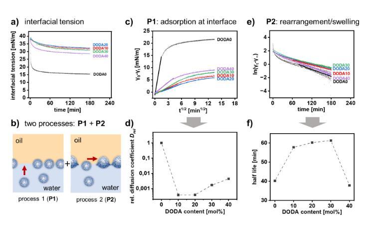 圖3展示了不同疏水性納米凝膠(ANGs)在甲苯/水界面張力(IFT)方面的研究結(jié)果。隨著ANGs的疏水性增加,甲苯/水界面張力隨時(shí)間非線性降低,但不同ANGs的降低速率不同(圖3a)。IFT的降低分為兩個(gè)階段:初始快速降低(P1)和隨后緩慢松弛到平衡狀態(tài)(P2)(圖3b)。通過分析P1階段,可以得到描述ANGs界面吸附速率的擴(kuò)散系數(shù)D(圖3c)。不同ANGs的相對(duì)擴(kuò)散系數(shù)Drel(相對(duì)于DODA0)與ANGs的DODA含量相關(guān):親水的DODA0和疏水的DODA40顯示出最快的界面吸附速率(圖3d)。通過分析P2階段,可以得到描述ANGs重新排列速率的半衰期(圖3e)。半衰期與ANGs的DODA含量相關(guān):親水的DODA0和疏水的DODA40顯示出最快的重新排列速率(圖3f)。