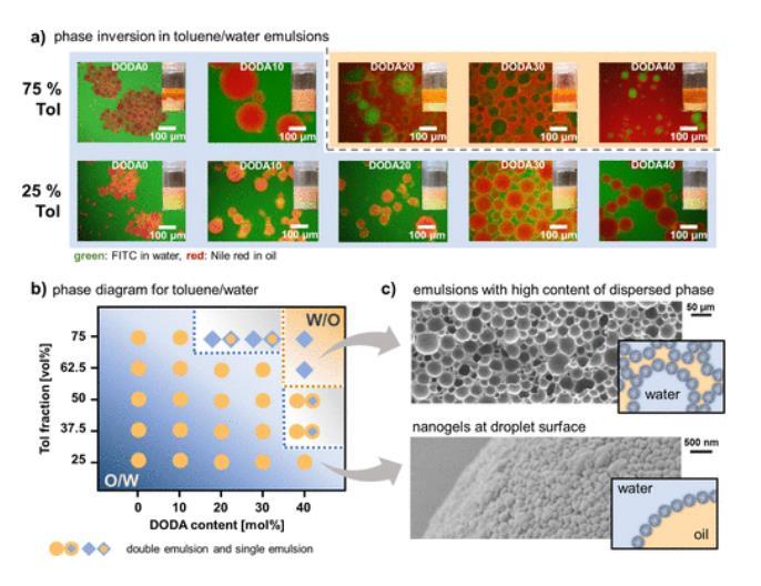 圖2展示了使用不同親水性納米凝膠(DODA含量)制備的甲苯/水Pickering乳液的類型。具體來說,圖2a通過熒光顯微鏡圖像和照片顯示了不同DODA含量下的甲苯/水乳液,其中25 vol%的甲苯觀察到O/W乳液,而在75 vol%的甲苯中,從DODA10到DODA20觀察到從O/W到W/O的相變。圖2b總結(jié)了甲苯/水乳液系統(tǒng)中乳液類型對(duì)納米凝膠的DODA含量和乳液的油相體積分?jǐn)?shù)的依賴性。圖2c通過SEM圖像展示了高分散相含量(DODA40,Tol-75)乳液和納米凝膠(DODA20,Tol-25)在粒子/液滴表面的存在。